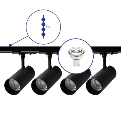 Description Bright Choice Ensemble complet Rail Monophasé Rail 1 Mètre Noir | incl. 4x Spot + GU10 2700K 3W Dimmable + Embout, Connecteur d’Alimentation