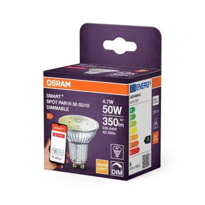 Description Osram Smart+ Spot LED Réflecteur GU10 PAR16 4.7W 350lm 45d - 827 Blanc Très Chaud | Zigbee Dimmable - Équivalent 35W