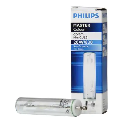 De Philips CDM-Tm Mini kenmerkt zich door de goede kleurweergave (>90Ra) en een kleurtemperatuur van 3000K.De Philips CDM-Tm Mini 20W 830 GU6.5 (MASTERColour) gasontladingslamp heeft een eenvoudige lampvoet, namelijk de GU6.5. De lampen zijn niet dimbaar.